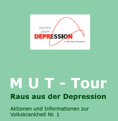 Ängste abbauen und Barrieren verringern – das hat sich das Bündnis gegen Depression, ein bundesweit spendenfinanzierter Zusammenschluss im psychosozialen Bereich Tätiger und Interessierter, zur Aufgabe gemacht. Um der „Volkskrankheit Nr. 1“ ein Gesicht zu geben und sie bewusst zum Thema zu machen, veranstaltet das lokale Bündnis in Siegen-Wittgenstein und Olpe wieder die Aktionswochen „Mut-Tour – Raus aus der Depression“.