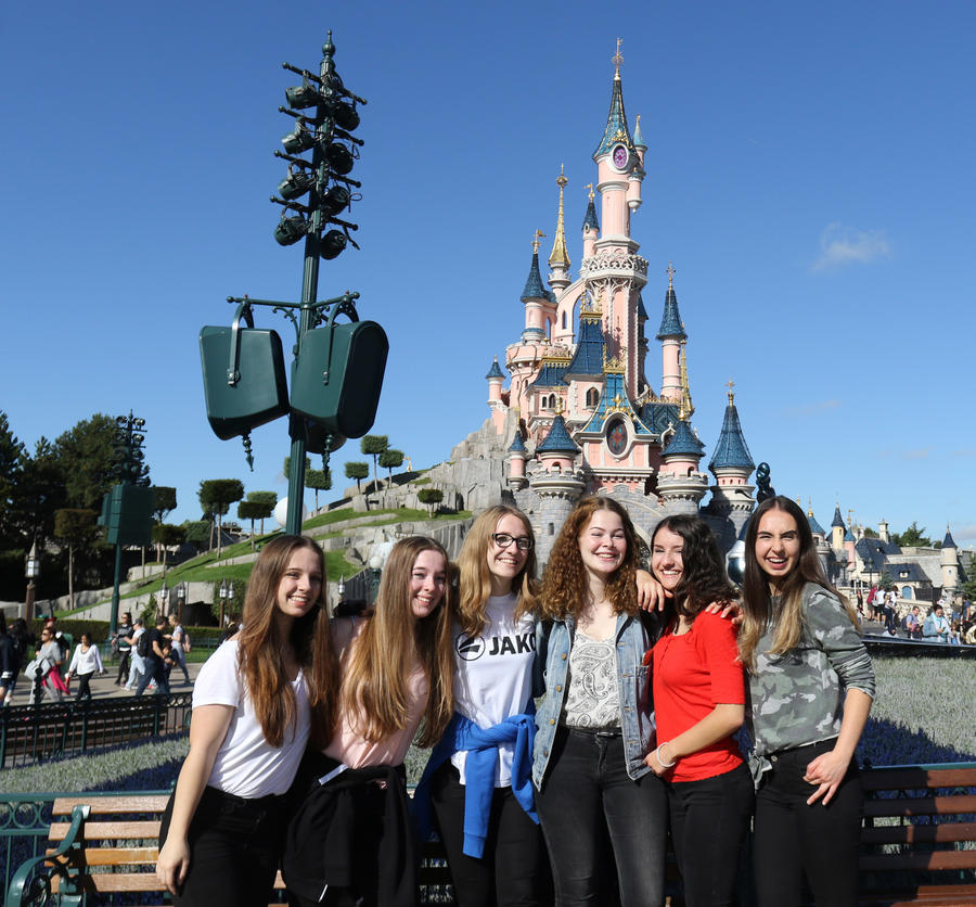 Nach einem Gruppenfoto vor dem Schloss war die Abenteuerlust der Schüler nicht mehr zu bremsen. Schließlich warteten unter anderem rasante Achterbahnfahrten im „Space Mountain“ oder mit „Indiana Jones and the Temple of Peril“ auf sie. Richtig bunt ging es am Nachmittag bei der weltbekannten Parade der Disney Stars zu. Unter strahlender Sonne zogen Goofy, Peter Pan, Mickey Mouse, Elsa, die Eiskönigin, und viele andere berühmte Figuren an den Besuchern vorbei und winkten kräftig!