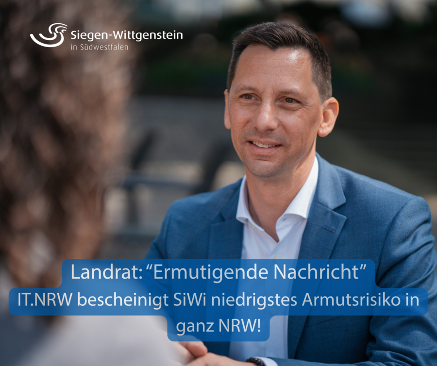 Nirgendwo in Nordrhein-Westfalen ist das Risiko, in Armut abzugleiten, so niedrig wie in Siegen-Wittgenstein. Das hat das Statistische Landesamt jetzt mitgeteilt. Landesweit liegt die so genannte „Armutsgefährdungsquote“ bei 17,8 Prozent, in der Region Siegen – zu der auch der Kreis Olpe gehört – nur bei 12,9 Prozent. Damit liegt Siegen-Wittgenstein auf dem Niveau von Bayern – dem Bundesland, das deutschlandweit mit 12,8 Prozent die niedrigste Armutsgefährdungsquote aufweist. Für Landrat Andreas Müller ist das ein weiterer Beleg für die Wirtschaftsstärke unserer Region und die hohe Lebensqualität, die Siegen-Wittgenstein ausmacht. Zugleich sieht er aber auch keinen Grund, die Hände in den Schoß zu legen – insbesondere mit Blick auf Kinderarmut.