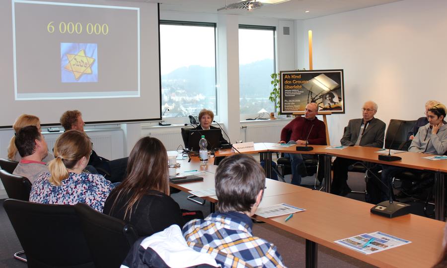 Absolute Stille herrschte in dem Besprechungsraum, in dem Michaela Vidláková von ihrer Kindheit in Prag erzählte, die nach und nach immer mehr durch die Schreckensherrschaft der Nazis geprägt war. Wie gebannt hörten die Jugendlichen und Erwachsenen zu. Dass die Juden im Protektorat Böhmen und Mähren irgendwann keine Haustiere mehr haben durften, dass Spielplätze und später auch der Schulbesuch für jüdische Kinder verboten waren und dass die kleine Michaela keine Spielkameraden mehr fand. Wie das Leben sich immer mehr einschränkte, wenn man Jude war. Die Juden durften nur noch in bestimmten Geschäften zu bestimmten Zeiten einkaufen, nicht mehr mit der Straßenbahn fahren und es gab noch viele weitere Einschränkungen, berichtete die Zeitzeugin. Anschließend erzählte sie von ihrer Deportation und der schlimmen Zeit im Konzentrationslager Theresienstadt. Sie selbst sagte: „Dieses Mädchen hat ein großes Glück gehabt“ – gemeinsam mit ihren Eltern hat sie überlebt. Heute macht sie sich für Frieden und Versöhnung stark, gemäß einer jüdischen Weisheit: „Das Geheimnis der Versöhnung heißt Erinnerung.“ Die Zuhörer ermahnte sie: „Ihr seid nicht verantwortlich für das, was damals passiert ist. Aber ihr seid für euch selbst und die Zukunft verantwortlich. Haltet zusammen und kämpft gegen die Gewalt, man darf so etwas nicht zulassen!“