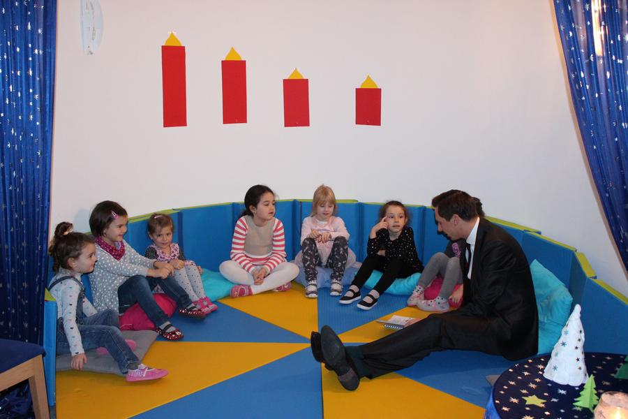 Auch in diesem Jahr besuchte Landrat Andreas Müller wieder die Jüngsten und las den Kindern im katholischen Kindergarten St. Peter und Paul in der Kreutzstraße in Siegen vor. Mitgebracht hatte er das Buch „Weihnachtsgeschichten vom kleinen Raben Socke“. Begeistert lauschten die kleinen Mädchen dem Landrat und lachten über den frechen kleinen Raben, der die Zahlen durcheinander brachte, sodass für den vierten Advent nicht vier, sondern 100 Kerzen bereit lagen. Zum Dank bekam Andreas Müller ein selbstgebasteltes Windlicht für sein Büro geschenkt.