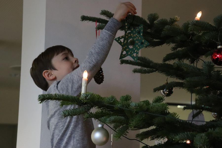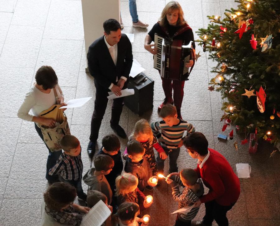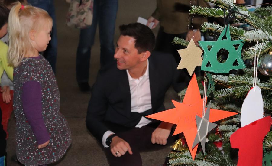 Landrat Andreas Müller half den Kindern beim Schmücken des Weihnachtsbaumes und stimmte auch in die vorweihnachtlichen Ständchen wie „In der Weihnachtsbäckerei“ oder „Oh Tannenbaum“ mit ein. Zum Dank für ihren Einsatz bekamen die Kinder Saft und Plätzchen und wurden vom Landrat zur Aufführung des MINT-Puppentheaters „Dr. Brumm“ ins Lÿz eingeladen.